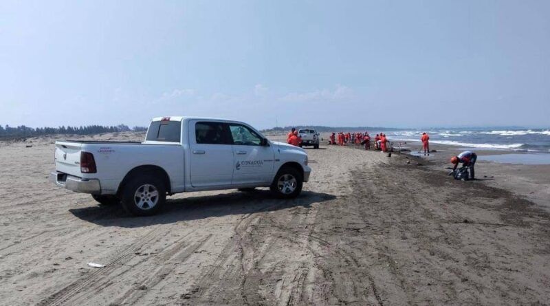 Conagua toma muestras en playas del sur de Veracruz tras derrame de hidrocarburos.