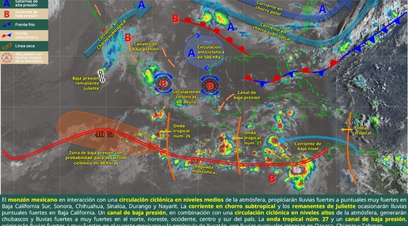 Todo esto es ocasionado por la onda tropical número 27 sobre el sureste de México, que avanza hacia el oeste a una velocidad promedio de 25 kilómetros por hora, apoyada por un canal de baja presión.