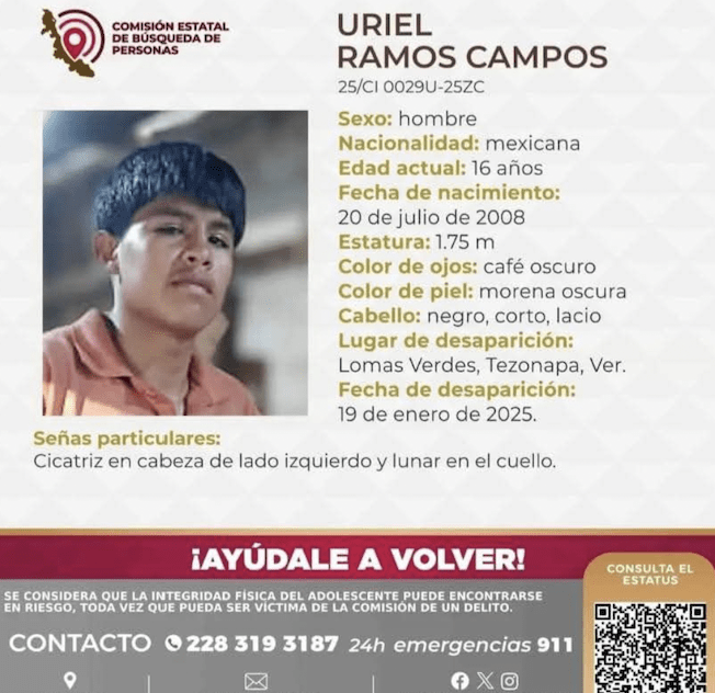 Ayúdanos a localizar a Uriel Ramos Campos es de Tezonapa de la región de la cuenca del Papaloapan en Veracruz, la familia dice que les avisaron que al parecer lo vieron en por Sebastopol y en la comunidad de la Reforma del municipio de Tuxtepec, Oaxaca, México.