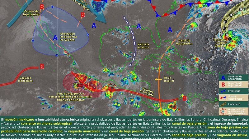 Los efectos mencionados, son causados por una zona de baja presión con alta probabilidad de desarrollo ciclónico frente a la costa de Guerrero y Oaxaca, inmersa en la vaguada monzónica.