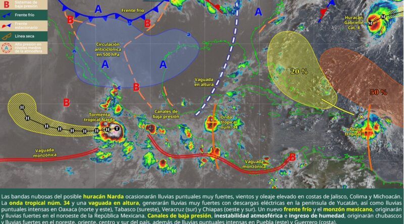 Todo esto derivado de la onda tropical número 34 sobre el sureste de México en combinación con una baja superior y la vaguada monzónica.