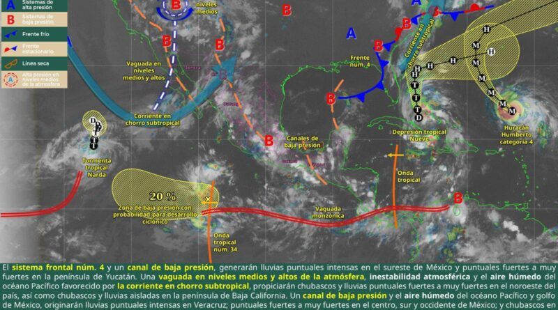 De acuerdo con el pronóstico del tiempo emitido por la Comisión Nacional del Agua (Conagua), estos fenómenos son ocasionados por un canal de baja presión y el frente frío número 4 que atraviesa el Golfo de México, el cual tendrá un cambio de viento al norte.