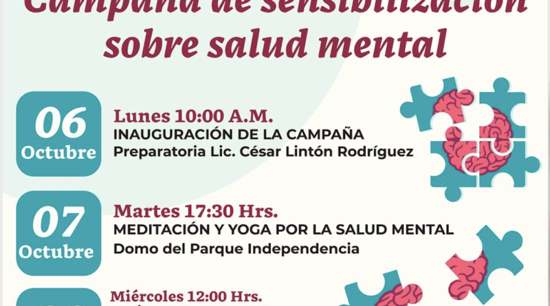 Los dos niveles de gobierno realizarán diversas actividades impartidas por profesionales en esta materia, en distintos espacios comunitarios: lunes 6 de octubre, a las 10:00 horas: inauguración de la campaña en la Escuela Preparatoria César Linton; martes 7, a las 17:30 horas: sesión de meditación y yoga en el domo del Parque Independencia; miércoles 8, a las 12:00 horas: transmisión de un podcast con la comunidad terapéutica; y a las 17:30 horas, rodada ciclista desde el Parque Independencia.