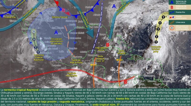 Estas condiciones se derivan de la vaguada monzónica que se observa en el Pacífico sur, que bordea la costa oaxaqueña e interactúa con la onda tropical número 37.