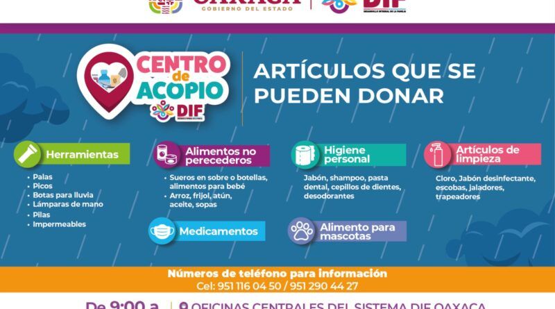 En solidaridad con las familias afectadas por las fuertes lluvias registradas en los últimos días, el Sistema Estatal para el Desarrollo Integral de la Familia (DIF) Oaxaca habilitó un centro de acopio en sus oficinas centrales, ubicadas en la calle Vicente Guerrero número 114, colonia Miguel Alemán Valdés, de la capital del estado.