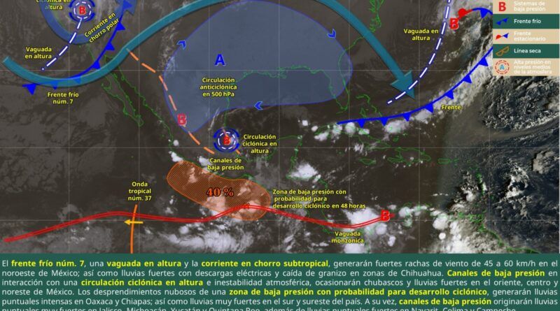 De acuerdo con el pronóstico del tiempo emitido por la Comisión Nacional del Agua (Conagua), estas condiciones son debido a una zona de baja presión con probabilidad de desarrollo ciclónico en inmediaciones del golfo de Tehuantepec, inmersa en la vaguada monzónica.
