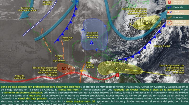 De acuerdo con el pronóstico del tiempo emitido por la Comisión Nacional del Agua (Conagua), estas condiciones son derivadas de una zona de baja presión con potencial para desarrollo ciclónico, ubicada al sur de Oaxaca y Guerrero, asociada a la vaguada monzónica.