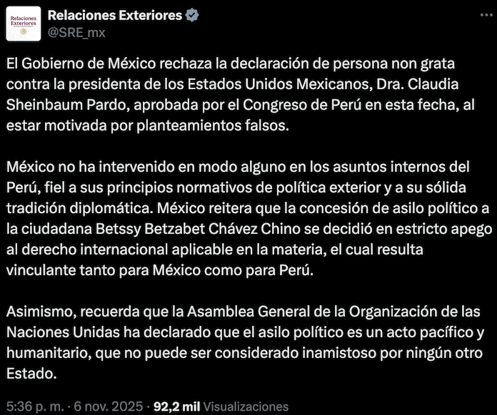 Asimismo, la SRE indicó que el Gobierno federal “reitera que la concesión de asilo político a la ciudadana Betssy Betzabet Chávez Chino se decidió en estricto apego al derecho internacional aplicable en la materia, el cual resulta vinculante tanto para México como para Perú”.