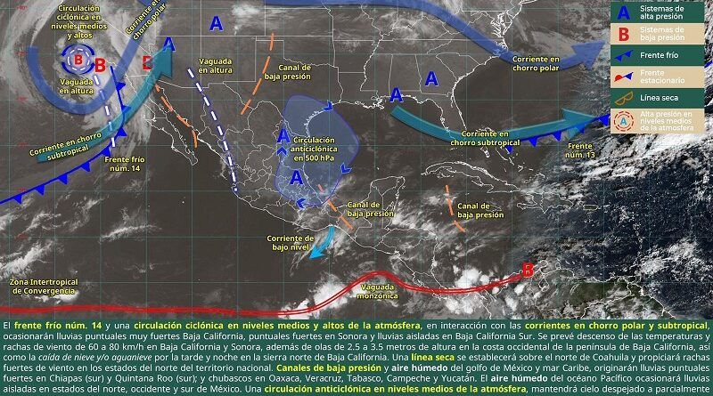 Por otro lado, la ausencia de nubosidad incrementará la radiación solar durante horas centrales del día; mientras que el viento del norte, de intensidad moderada, continuará presentándose en el Istmo y Golfo de Tehuantepec.