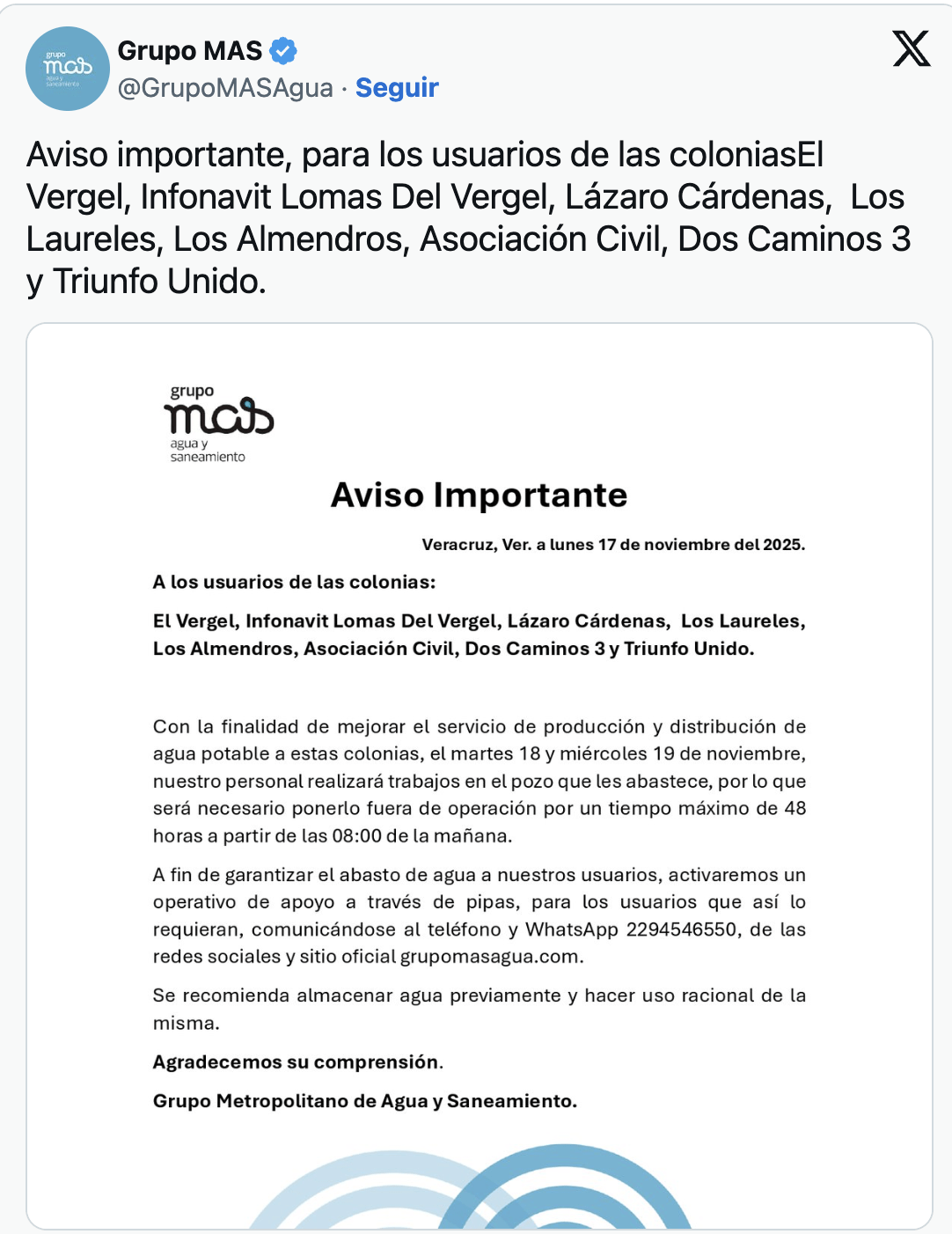 El Grupo Metropolitano de Agua y Saneamiento (Grupo MAS), dio a conocer que algunas colonias de Veracruz sufrirán falta de agua.
