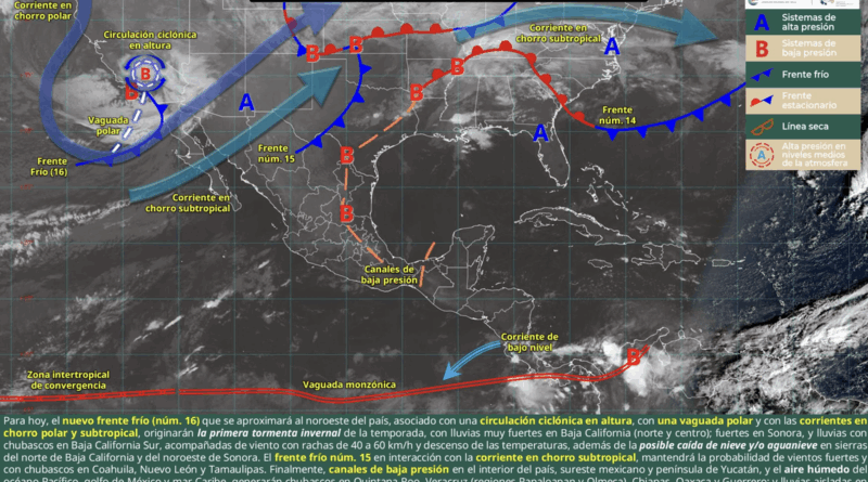 - Una vaguada polar permitirá el ingreso de un frente frío y de la primera tormenta invernal de la temporada hacia el noroeste de México