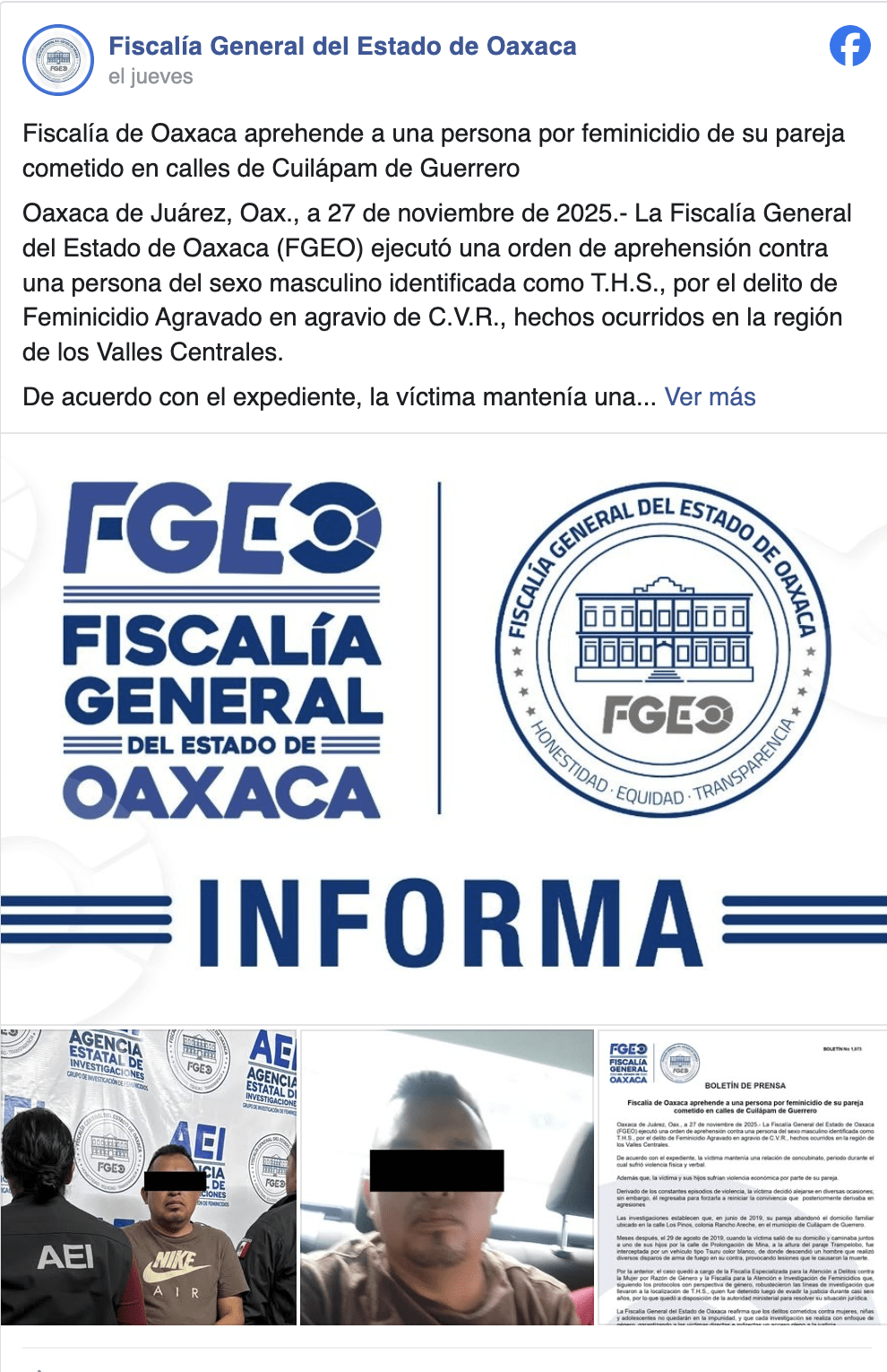 A través de un comunicado, la Fiscalía General del Estado de Oaxaca (FGEO) ejecutó una orden de aprehensión contra una persona del sexo masculino identificada como T.H.S., por el delito de Feminicidio Agravado en agravio de C.V.R., hechos ocurridos en la región de los Valles Centrales.
