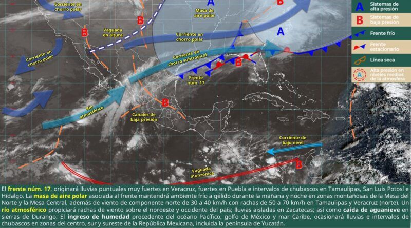 De acuerdo con el pronóstico del tiempo emitido por la Comisión Nacional del Agua (Conagua), un anticiclón bien estructurado en niveles medios y altos de la atmósfera, cuyo centro se ubica al oriente de la Península de Yucatán, mantiene una amplia influencia sobre ese territorio y el Caribe, además del sureste, centro y sur de México. Este sistema impide el avance del frente frío número 17 hacia Oaxaca.