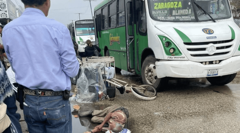 El percance se registró alrededor de las 9:00 de la mañana, en la intersección de las calles Juan Osorio López y Olmeca, cuando un autobús del servicio de transporte público local, número económico 173, con placas A-20383-X, impactó a un triciclo de carga conducido por un vendedor de bolillos.