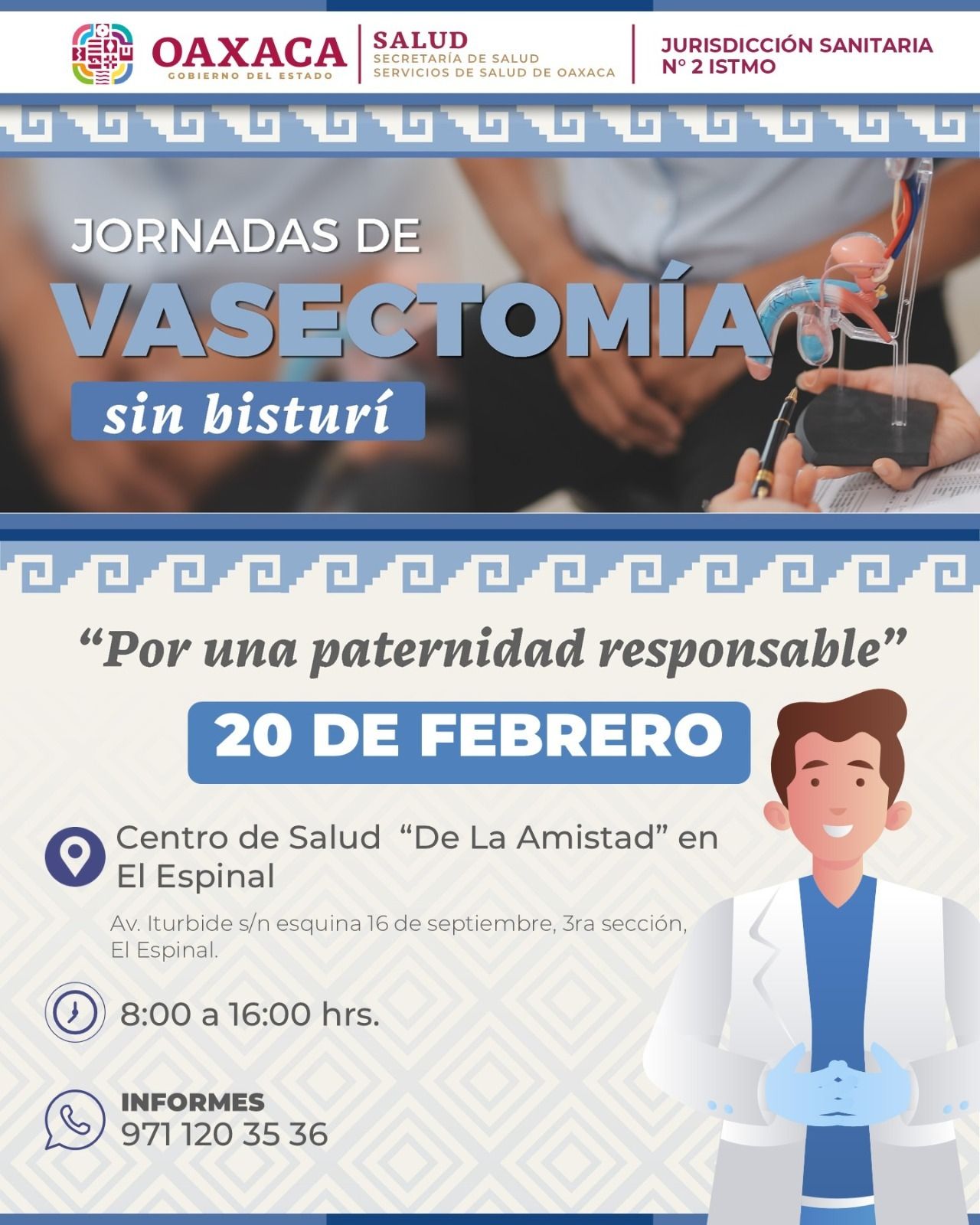 Heroica Ciudad de Juchitán de Zaragoza, Oax. 10 de febrero de 2026.- A fin de fortalecer la planificación familiar responsable, Servicios de Salud de Oaxaca (SSO), a través de la Jurisdicción Sanitaria 2 Istmo, llevará a cabo la jornada gratuita de Vasectomía sin Bisturí “Por una paternidad responsable”, el viernes 20 de febrero de 8:00 a 16:00 horas, en el centro de salud IMSS-Bienestar de El Espinal.