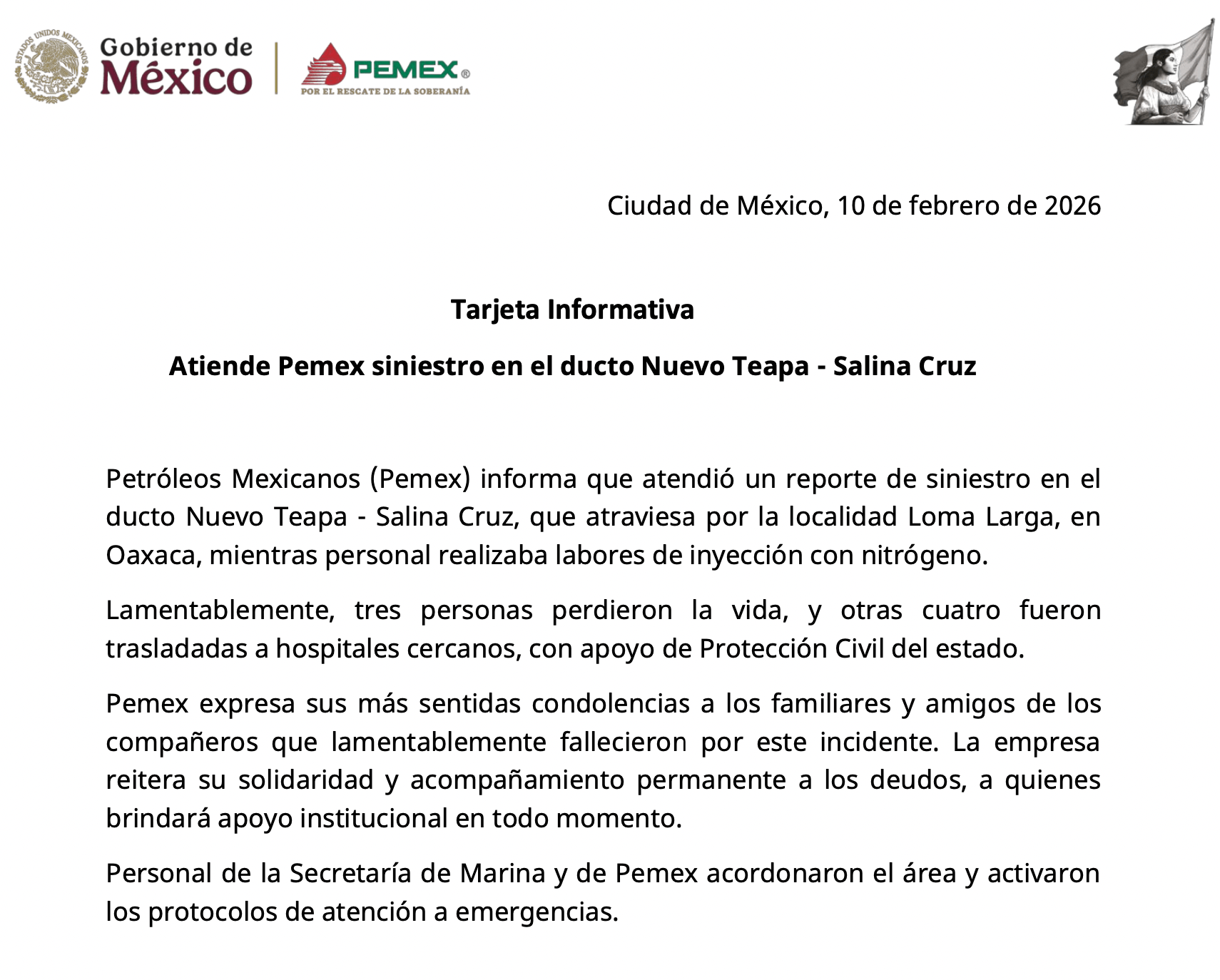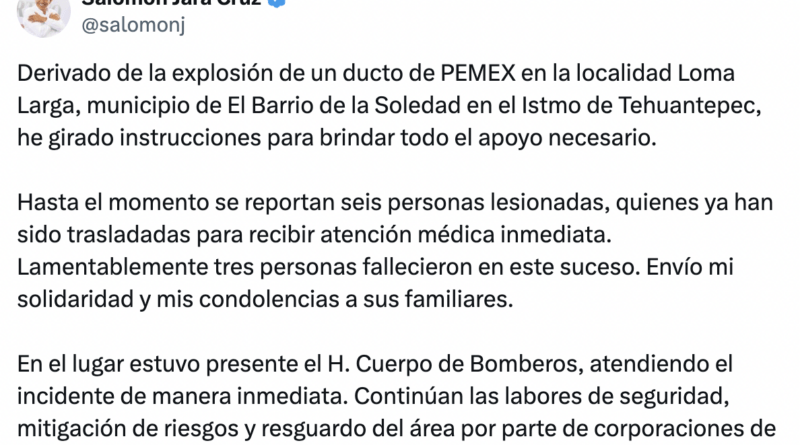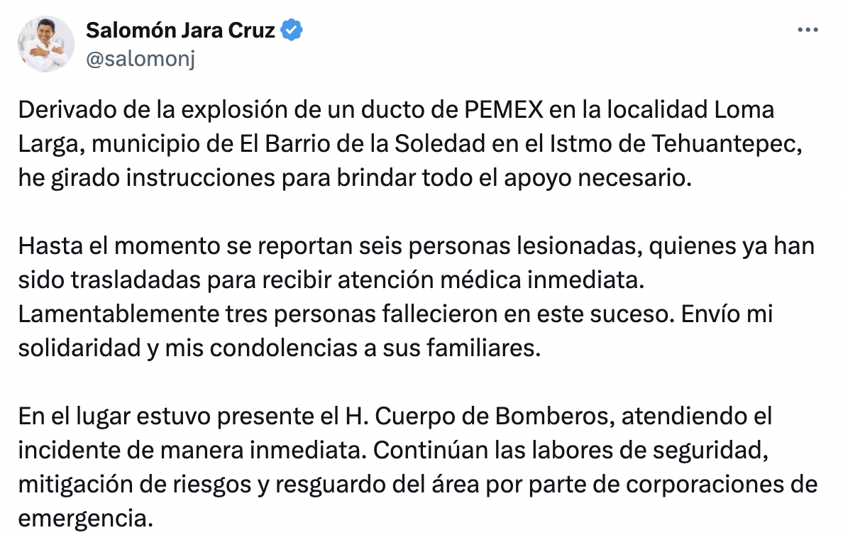 Derivado de la explosión de un ducto de PEMEX en la localidad Loma Larga, municipio de El Barrio de la Soledad en el Istmo de Tehuantepec, he girado instrucciones para brindar todo el apoyo necesario.