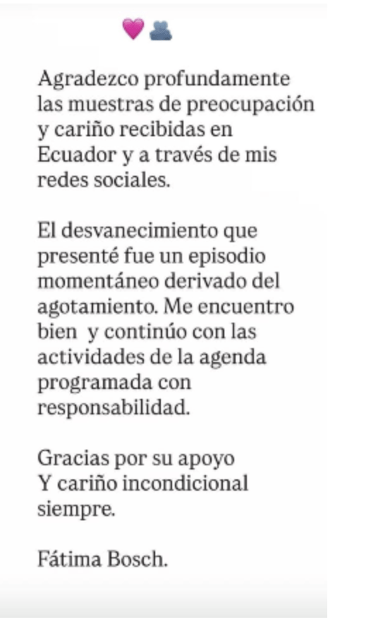 “Agradezco profundamente las muestras de preocupación y cariño recibidas en Ecuador y a través de mis redes sociales.