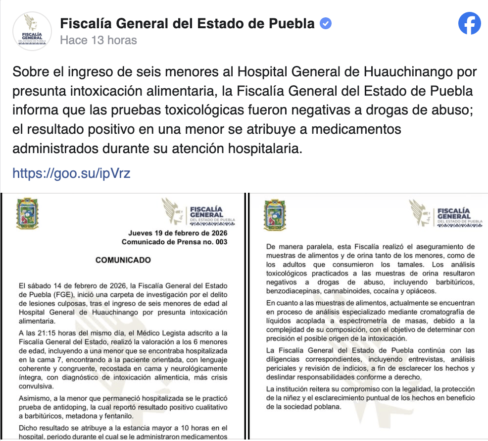 La Fiscalía General del Estado (FGE) de Puebla informó este jueves 19 de febrero que una de las seis menores hospitalizadas por presunta intoxicación alimentaria en Huauchinango dio positivo a fentanilo en una prueba toxicológica, pero no fue por los tamales que consumieron.