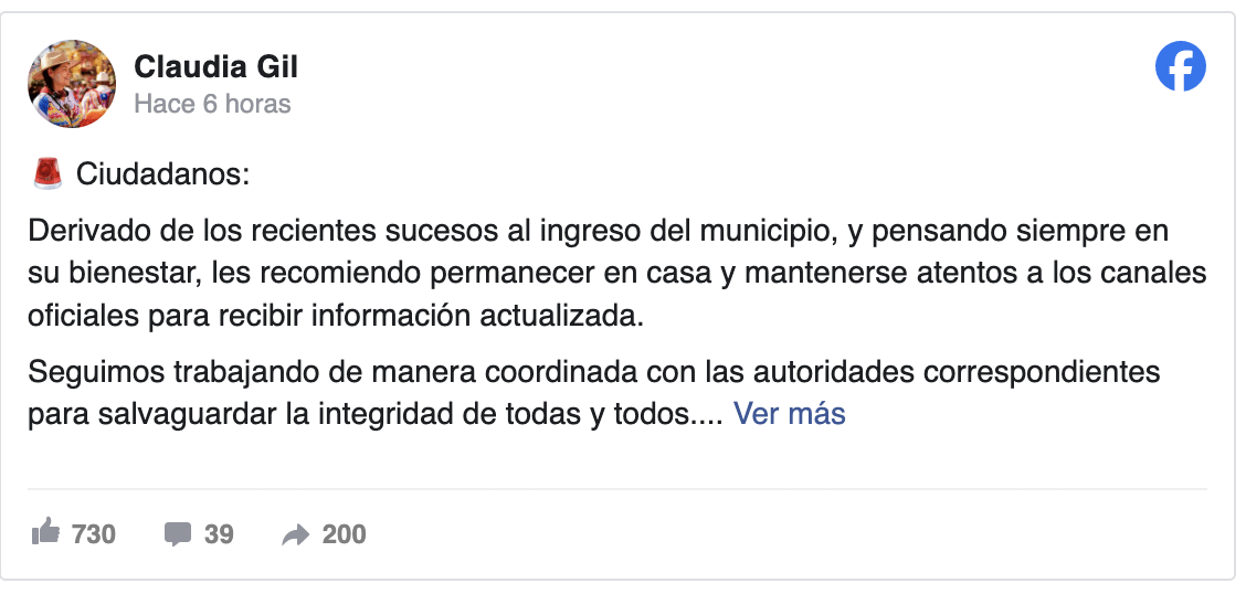 “Derivado de los recientes sucesos al ingreso del municipio, y pensando siempre en su bienestar, les recomiendo permanecer en casa y mantenerse atentos a los canales oficiales para recibir información actualizada”, publicó la edil.