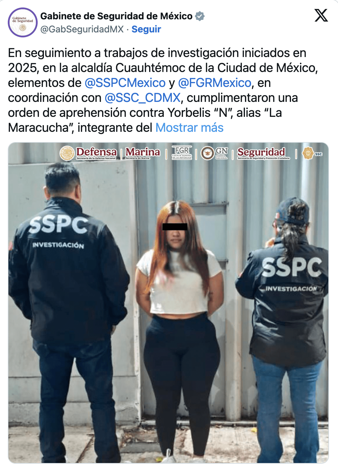 A través de un comunicado, el Gabinete de Seguridad de México informó que la arrestada, identificada como Yorbelis “N”, alias ‘La Maracucha’, es de nacionalidad extranjera y fue arrestada en la alcaldía capitalina de Cuauhtémoc, en la cual tenía su base de operaciones a través de varios hoteles de la zona.