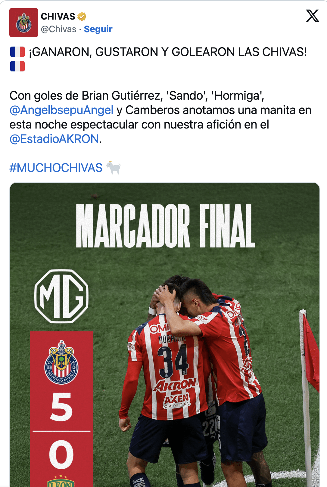 Con este resultado, Chivas se coloca como líder del Clausura 2026 con 27 puntos, uno más que su perseguidor, Cruz Azul.